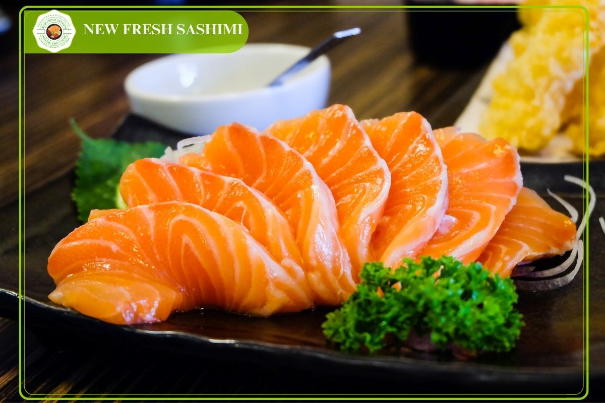 Sashimi cá hồi tại New Fresh món ăn bán chạy nhất, ngoài ra còn đa dạng các loại sashimi nổi tiếng khác th hồ cho khách hàng lựa chọn.