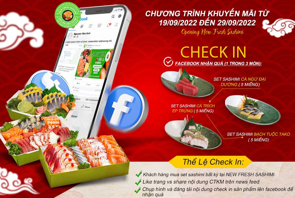 Tháng 9 này, New Fresh Sashimi ra mắt cùng các tín đồ ẩm thực, mời bạn lên hẹn Check-in để được nhận quà liền tay nhé! Chỉ cần Check-in cùng New Fresh Sashimi bằng những bức ảnh xinh xẻo của các bạn sẽ được nhận ngay những phần Sashimi cực kỳ tươi ngon