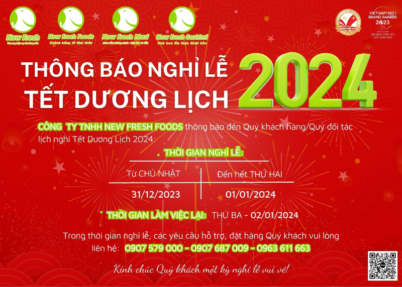 Kính gửi Quý khách hàng,đối tác, Công Ty TNHH New Fresh Foods xin trân trọng thông báo lịch nghỉ Tết Dương Lịch 2024 như sau: