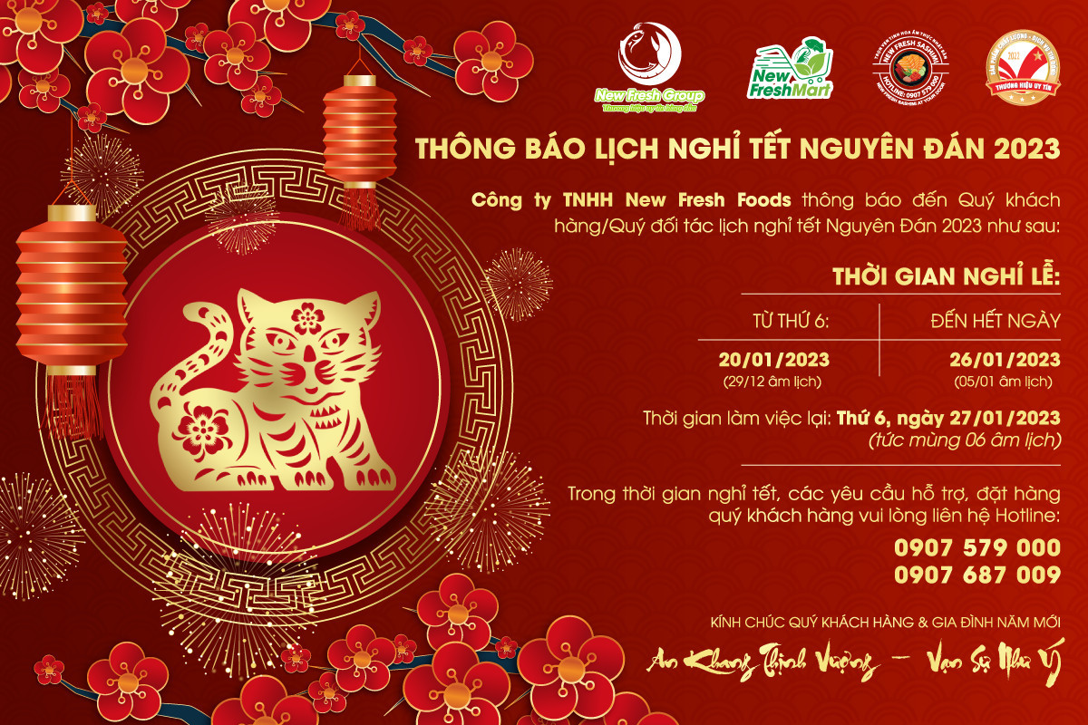 Kính gửi quý khách hàng/đối tác, Công Ty TNHH New Fresh Foods xin trân trọng thông báo lịch nghỉ Tết Nguyên Đán 2023 như sau: