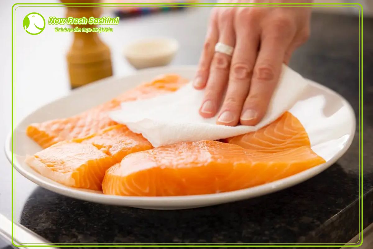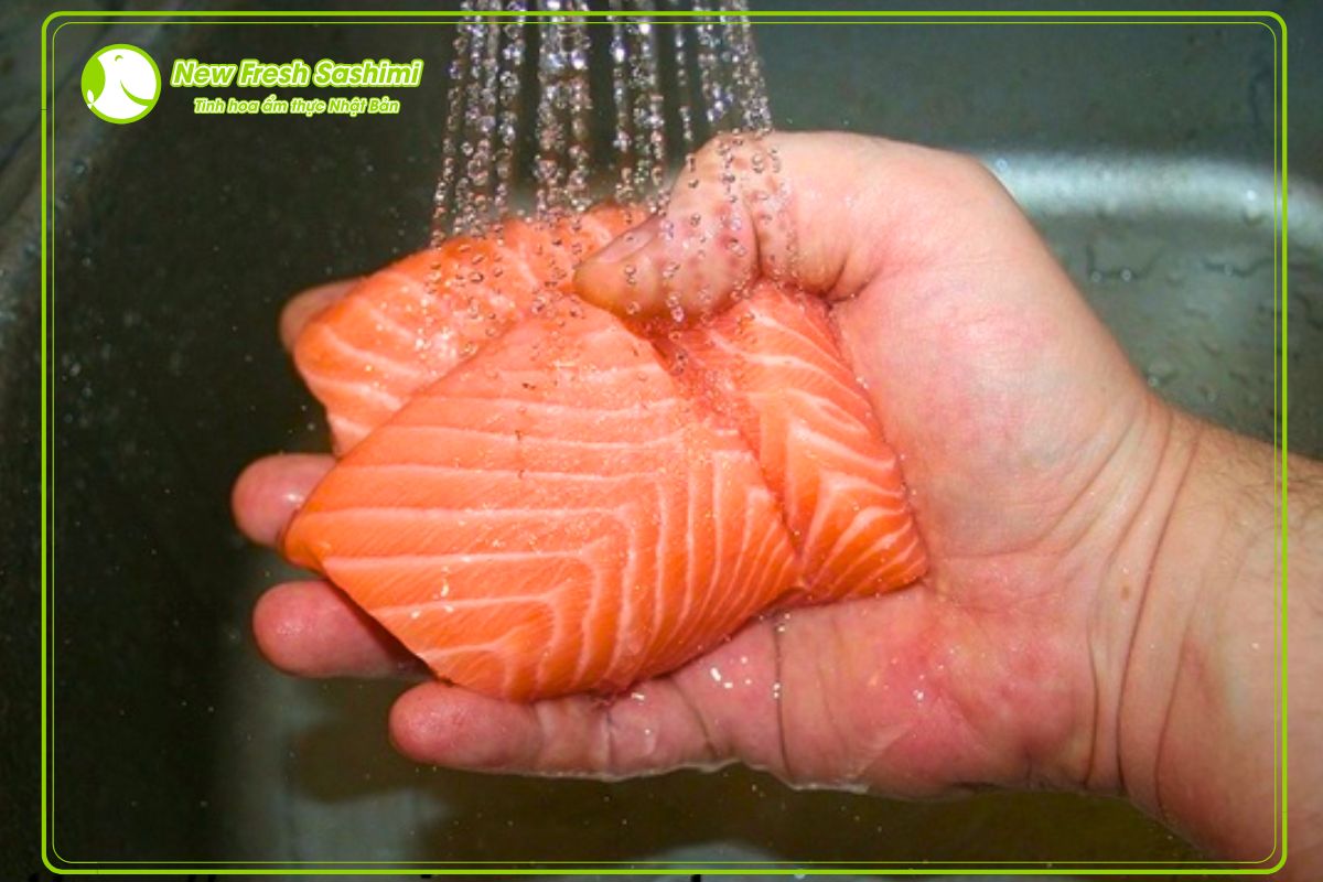 Bước 1: Sơ chế sạch nguyên liệu sashimi thật kỹ và đúng cách rửa nhẹ nhàng với nước, sau đó để ráo nước bằng cách dùng khăn sạch thấm khô bề mặt của các nguyên liệu.
